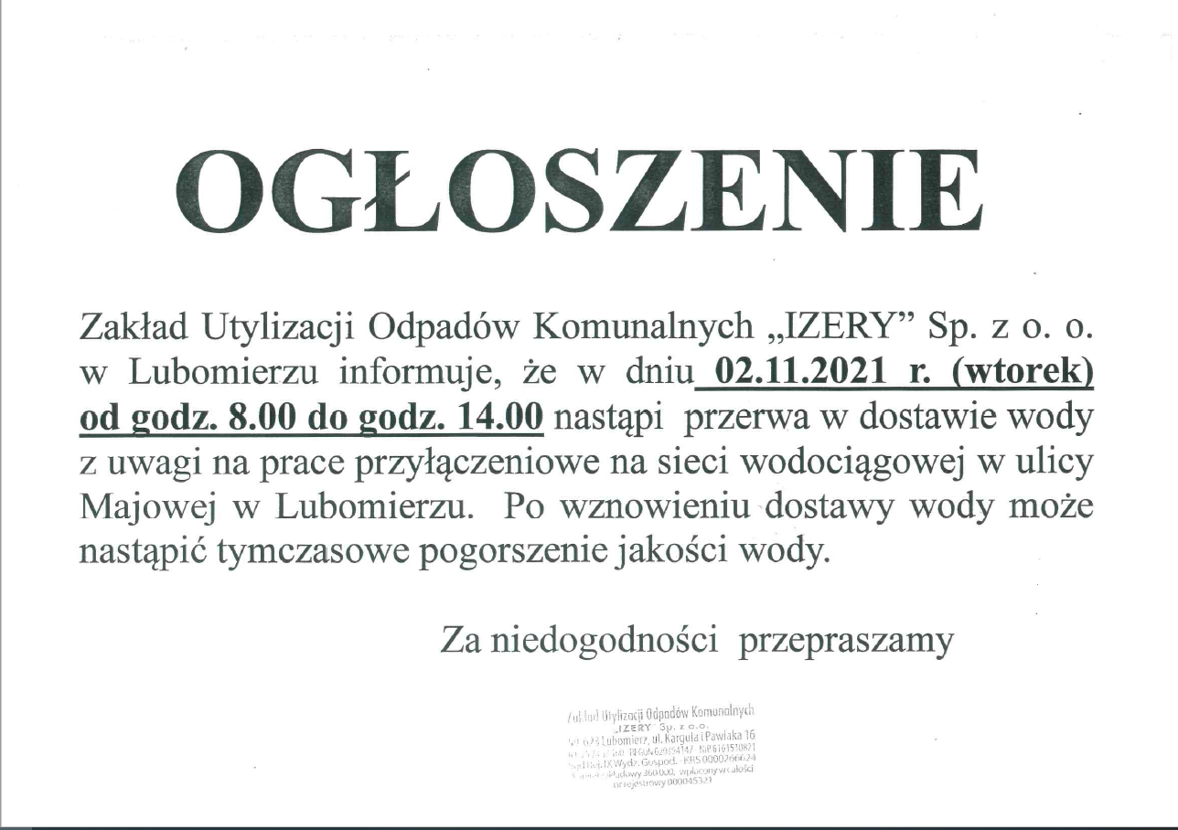 OGŁOSZENIE- przerwa w dostawie wody pitnej