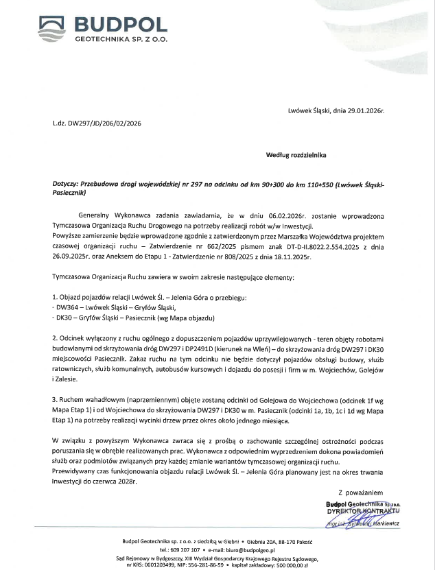 Informujemy, że w związku z realizacją inwestycji pn. „Przebudowa drogi wojewódzkiej nr 297” na odcinku Lwówek Śląski – Pasiecznik, od dnia 6 lutego 2026 r. zostanie wprowadzona Tymczasowa Organizacja Ruchu Drogowego.