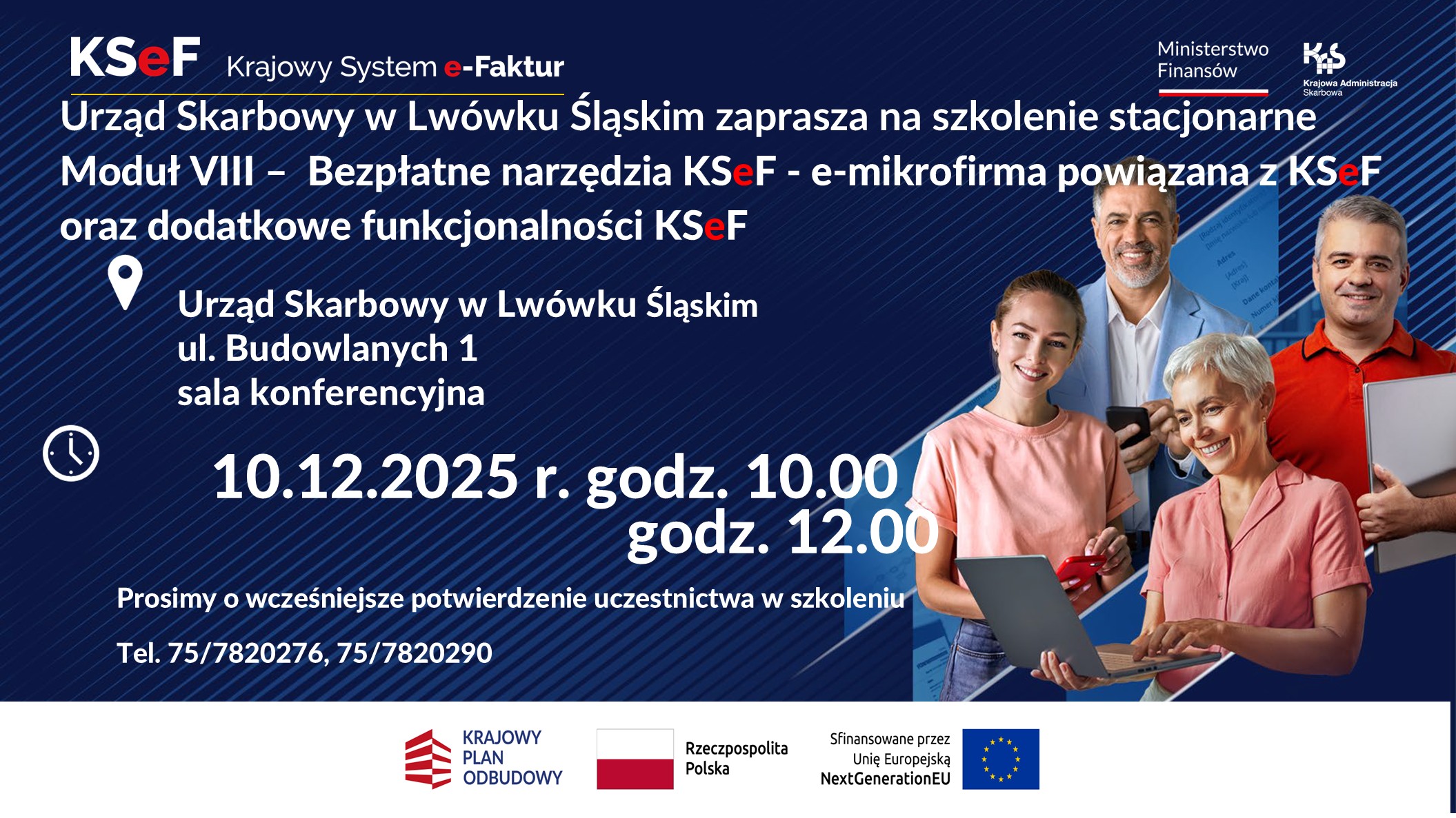 Urząd Skarbowy w Lwówku Śląskim zaprasza na szkolenie stacjonarne Moduł VIII – Bezpłatne narzędzia KSeF - e-mikrofirma powiązana z KSeF oraz dodatkowe funkcjonalności KSeF.
