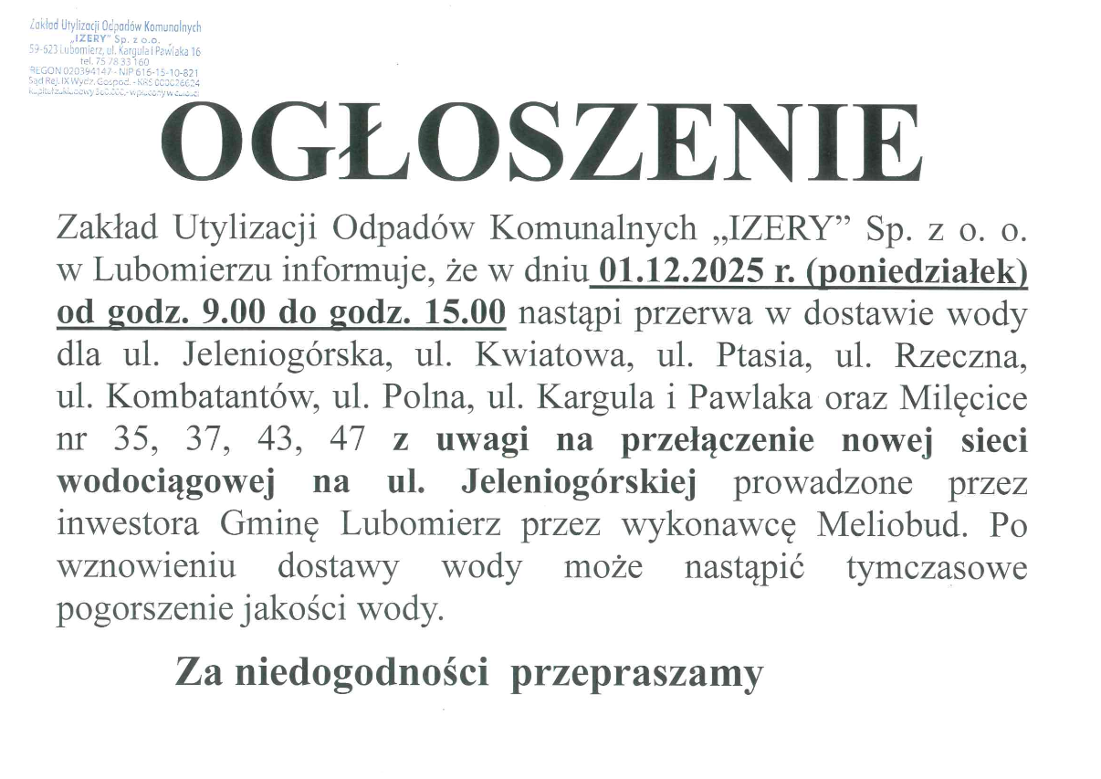 01 - 12 - 2025 UWAGA !!! Z DNIA 01.12.2025r. (PONIEDZIAŁEK ) OD GODZ. 9.00 GODZ. 15.00- PRZERWA W DOSTAWIE WODY